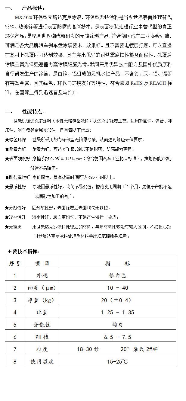 產(chǎn)品名稱:MX7320環(huán)保型無鉻達克羅涂液